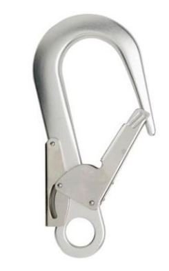 Aluminium veiligheidshaak voor steigers. Voorzien van automatische vergrendeling. Opening: 60 mm. Maximale weerstand: 22 kN.
