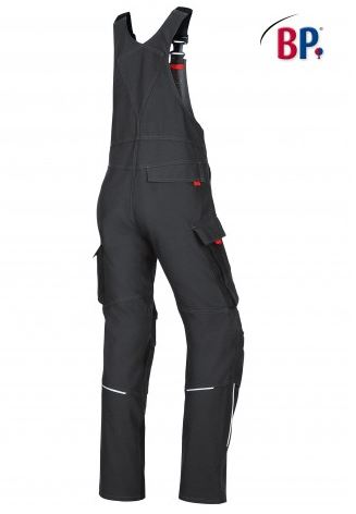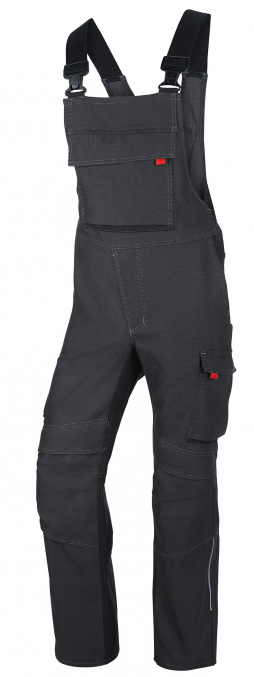 Extra brede elastische schouderbanden voor meer draagcomfort met kunststof gespen, ergonomische snit, grote dubbele borstzak met klepsluiting, waarvan 1 met blinde ritssluiting, 2 zijzakken, 1 ruime beenzak met smartphonevak aan de binnenkant, beenzak met klepsluiting, hoog ruggedeelte, stretch inzetstuk aan de zijkant voor comfortabele bescherming, 1 duimstokzak met opgezette pennenvakken en klepsluiting, 1 achterzak met klepsluiting, ergonomisch gevormde broekspijpen, reflecterende biezen zijwaarts en achter aan de onderkant van de broekspijp, kniezakken voor kniekussens 1839 000 53 (moeten apart besteld worden).