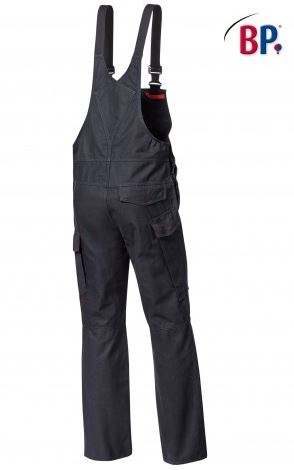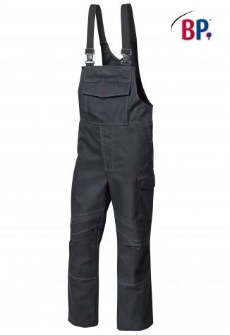 Elastische schouderbanden met kunststof gespen, grote dubbele borstzak met klep, waarvan 1 met blinde ritssluiting, 1 pennenvak, verlengd rugpand, 2 zijzakken, 1 ruime beenzak met klep, 1 duimstokvak met klep, 1 achterzak met klep, kniezakken met plooi en klepsluiting voor kniebeschermers 1839 000 53 (apart bestellen).