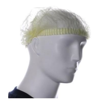 Baret gemaakt van polypropyleen. Clip model. Lengte: 52 cm (uitgerekt). Latexvrij elastiek. Verpakt per 100 stuks. Doosverpakking: 10x100 stuks. Kleur: geel.