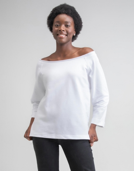 Brede, afhangende schouder met onafgewerkte rand in de nek