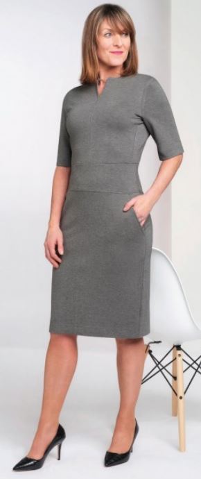 Notch neckline, half sleeve, wide stretch waistband, two side pockets and centre back zip with satin ribbon detail. Centre back length at size 12R = 99.5cm.