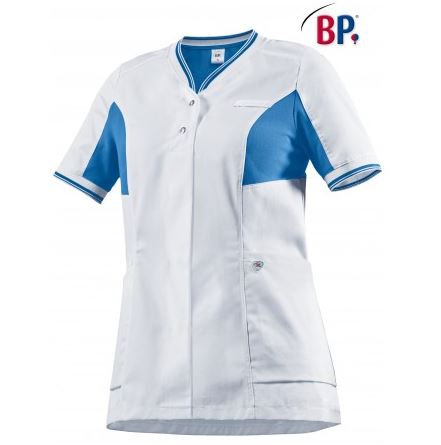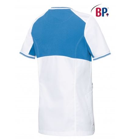 1/2 mouw, maximale bewegingsvrijheid door piqué-inzetstukken, V-hals, blinde drukknopenlijst met 2 zichtbare drukknopen, 2 ruime zijzakken waarvan 1 met pieperzak, sleutellus, lus voor naambordje.