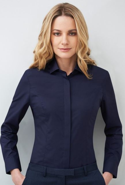 Cotton rich, long sleeve ladies blouse, easy care and easy iron practicality.