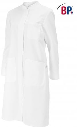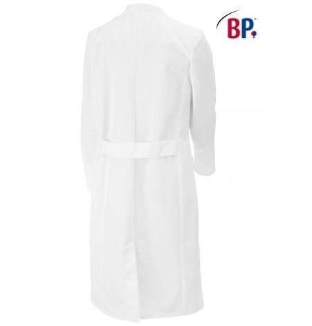 Lange mouw, opstaande kraag, blinde drukknopenlijst, 1 borstzak, 2 zijzakken, split in het rugpand, riem in het rugpand.