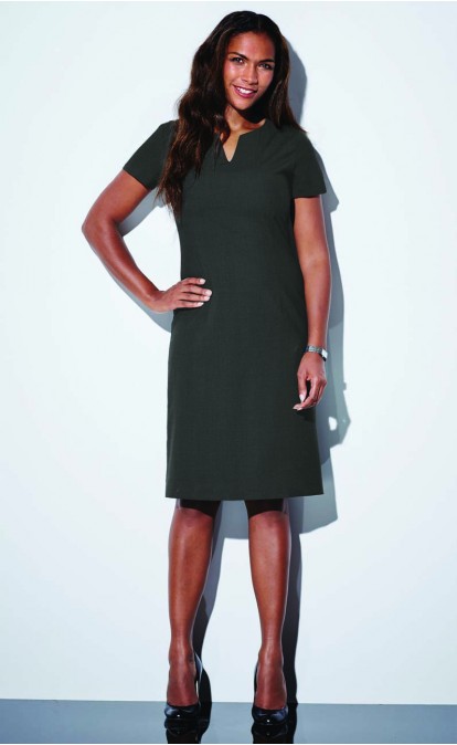 Product details Modern styled tailored dress with notch neckline, available in black or charcoal.The Qualitas2.0 fabric combines hardwearing Polyester, Lycra® for stretch and movement, Teflon® for stain-resistance and Wool for natural breathability.