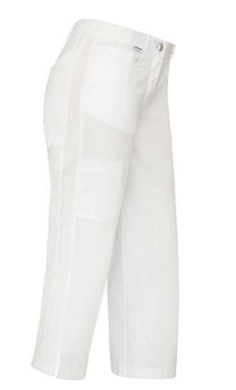 Sportieve 5-pocket damespantalon op 7/8-lengte met dijbeenzakje, sierstiksels in ecru, zijsplitten en verlaagde tailleband, welke gedeeltelijk is voorzien van elastiek