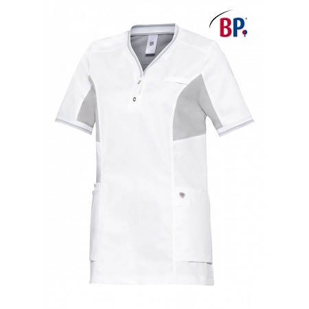1/2 mouw, maximale bewegingsvrijheid door piqué-inzetstukken, V-hals met twee drukknopen, 2 ruime zijzakken waarvan 1 met pieperzak, sleutellus, lus voor naambordje.