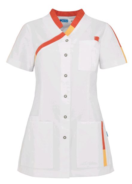 Getailleerd model met smal boordje in v-hals, diverse zakken. Kleuraccenten in oranje en rood, zijsplitten