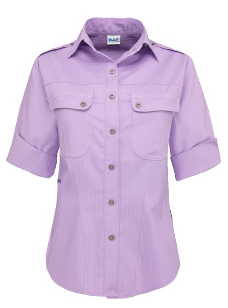 Getailleerd kort damesjack in ton sur ton-streep met 3/4 mouwen, dubbele ronde borstzak met klep, epauletten, schuine deelnaden, rond telefoonzakje op zijnaad, sierstiksels en zijsplitten.