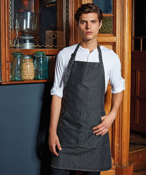 Deze denim bibschort is de moderne oplossing voor bars en restaurants die iets anders willen voor hun personeelsuniform. De volledige bibstijl zorgt voor een hygiënische bedekking tegen vlekken en kan industrieel op 85°C gewassen worden. De gesp in de nekband laat toe de lengte van het schort te regelen. Er zijn vier contrasterende voorzakken met stiksels, wat handig is voor het meedragen van betaalterminals en orderboekjes. De lussen in dezelfde stof kunnen achteraan dichtgeknoopt worden, maar ze zijn ook lang genoeg om rond het middel te draaien en vooraan te sluiten.