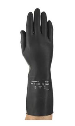 Ansell AlphaTec 87-118 zijn sterke, soepele werkhandschoenen en bieden een hoge weerstand tegen chemicaliën op waterbasis. De rubber handschoenen zijn daarom uitermate geschikt voor gebruik in de industrie. Natuurrubberlatex-coating. Gevlokte katoenen drager. Gerolde boord. Hoge weerstand tegen chemicaliën op waterbasis. Goede schuurweerstand. Sterke en soepele handschoen voor talrijke industriële toepassingen. Dikte: 0,80 mm. Lengte: 320 mm. AQL 0,65 (EN 374). Kleur: zwart.