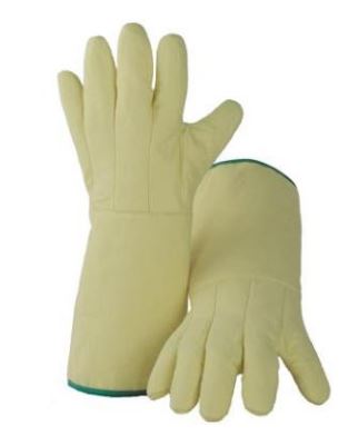 Lichtgewicht en comfortabele handschoen met een service temperatuur tot 600°C. Contacttijd 14 sec. bij 500°C, 19 sec. bij 350°C en 26 sec. bij 250°C. Vijf-vinger handschoen geheel vervaardigd uit heavy duty Para-Aramide vilt. De handschoen heeft een goede mechanische resistentie en heeft tevens een goede snijbestendigheid en perforatiebestendigheid. De handschoen wordt geleverd in één maat. Geadviseerd wordt de handschoen niet te wassen. Gebruikte materialen palmzijde: Heavy duty Para-Aramide vilt en Light duty Para-Aramide vilt. Gebruikte materialen rugzijde: Heavy duty Para-Aramide vilt. Lengte: 420 mm. Kleur: geel.