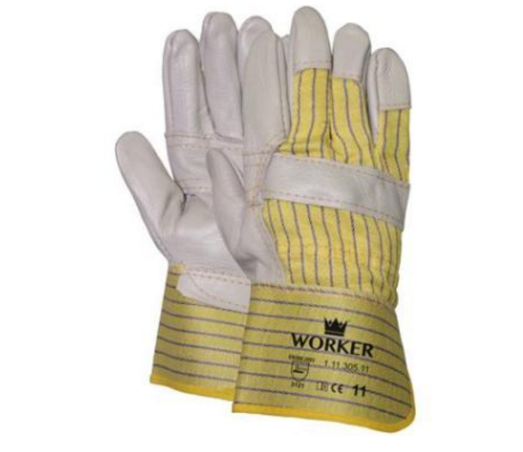 'Amerikaantje' handschoen gemaakt van meubel-rundleder (1.0-1.3 mm). Geel/blauw gestreept doek van polyester/katoen. Witte polyester/katoenen voering. Lederen knokkelversterking en palmversterking. 10 cm kap. Handschoen is Chroom-6 vrij.