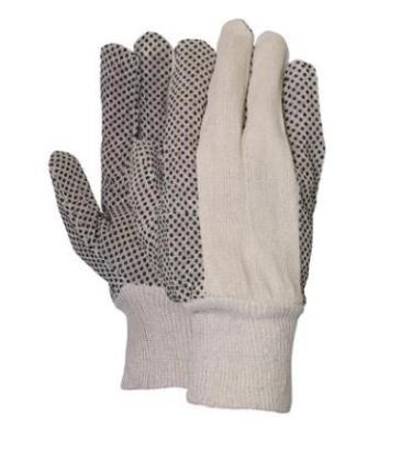 Handschoen gemaakt van 100% katoen. Tricot manchet.Zwarte PVC nopjes voor extra grip. Gewicht: 227 gram. Verpakt per dozijn (12 paar). Kleur: naturel.