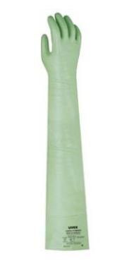 Een comfortabele beschermende NBR-handschoen, van naadloze lagen voorzien in een versterkte uitvoering. Goede weerstand tegen zuren, loog, mineraalolie, oplosmiddelen en een groot aantal chemicaliën. Hoge waterdampabsorptie van de katoenen voering. Handschoen van naadloze lagen voorzien, een katoenen interlock voering en een coating van speciaal NBR. Vrij van schadelijke stoffen conform Duitse Ökotex Standard 100. Contacthitte bestendig. Dikte: 0,50 mm. Lengte: 800 mm. Kleur: groen.
