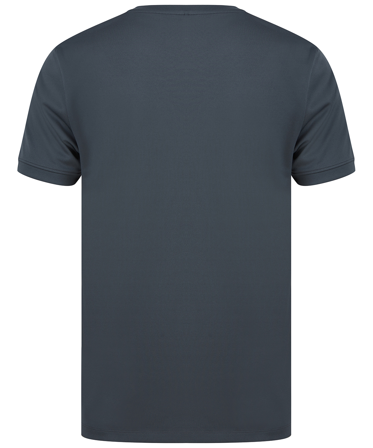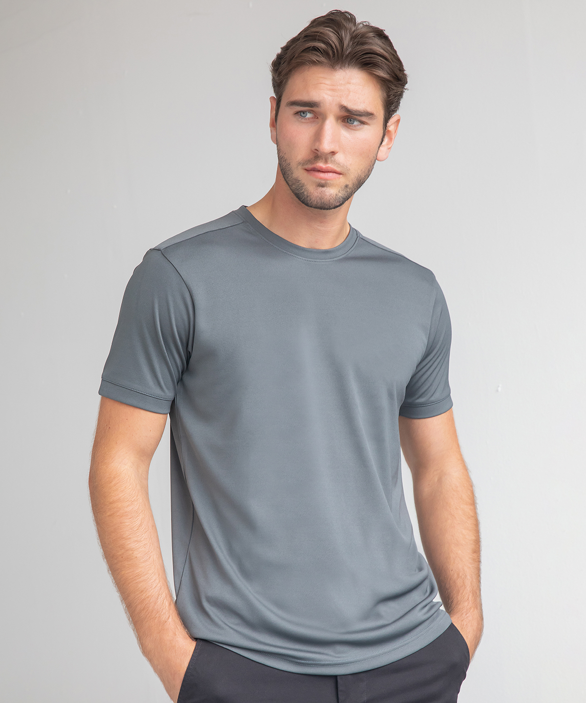 Go casual in a t-shirt that is on trend and will perform. The HiCool® permanent wicking yarn technology will keep you cool and fresh all day whilst looking on trend with its modern self-fabric neckline and cuffs. Men's t-shirt made with HiCool® permanent wicking fabric. Self-fabric crew neckline and cuffs with twin-needle stitching on hem. Slim fit.