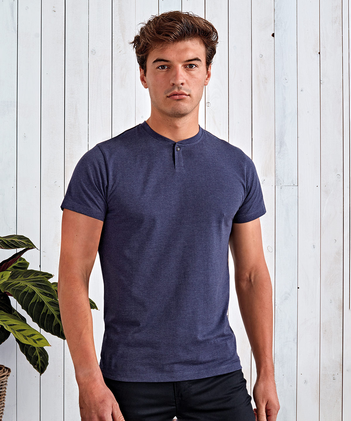 voor heren met korte mouwen, een populaire stijl voor bedienend personeel, is gemaakt van een milieuvriendelijke combinatie van gerecycled polyester en duurzaam katoen. Dit model dat is ontworpen met een enkele knoop op de sluiting en een smalle kraag met band, heeft een zacht aanvoelende stof.