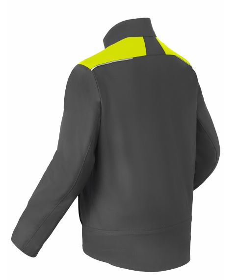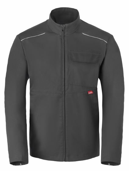 Ritssluiting, 1 borstzak links met verdekte drukknopen, mouwen met steldrukkers, 2 ingezette zijzakken met drukknoopsluiting, reflecterende piping, D-ring, verlengd rugpand.