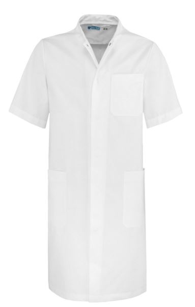 Herenjas, 1/1 lengte met boord en blinde drukknoopsluiting, 3 zakken en korte mouw.