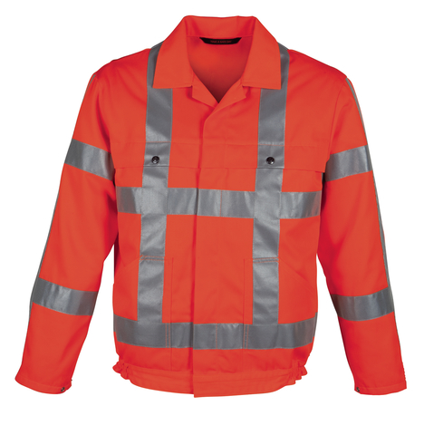 Verdekte drukknoopsluiting, 2 voorzakken, 2 borstzakken, elastiek in taille, rugplooien, mouwen met steldrukkers, reflectieband