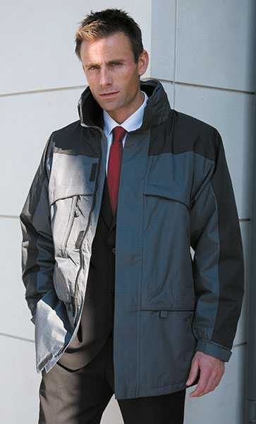 Buitenzijde: Ripstop Polyester met PVC-beschermlaag, voering: schouderdeel in Fleece, onderdeel in 190T Nylon Taffeta, Wattering: 150 grams/m² Polyester, verzegelde naden, afneembare verstelbare capuchon met klittenbandsluitingen kinbescherming, verborgen ritssluiting met windvanger en klittenbandsluiting, netvoering met ritssluiting onder de oksels, armafwerking met elastisch manchet en klittenband, 2 x borstzak en 2 voorzakken met rits, diverse binnenzakken incl. GSM zakje, kabelhouder, ID-kaarthouder, elastisch koord met stopper in taille en bij onderboord, reflector op onderkant rugpand, rits bij linker borstzak en onderin binnenzijde rugpand voor gemakkelijk bedrukken/borduren, AZO vrije materialen.