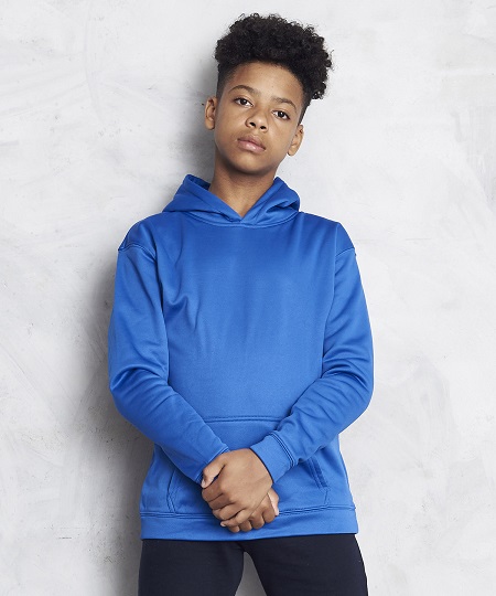 A warm and comfortable classic hoodie for kids. Featuring brushed back polyester, set-in sleeves and double fabric hood. Pair with jeans or joggers for a casual sporty look.