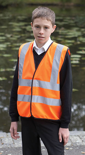 100% polyester, kinder veiligheidsjas met vertikale en horizontale reflecterende strepen aan voor- en achterkant, practische rip-strip sluiting aan de voorkant.