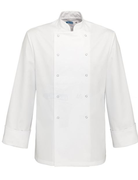 Koksjas met boord, lange mouw met manchet. Sluiting middels drukknopen