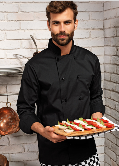 met zwarte plastic drukknoppen die kunnen worden verwijderd en vervangen door andere kleuren (PR652), zodat het culinaire team het restaurantmerk kan tonen. Ontworpen met een mandarijnkraag met stiksels aan de bovenkant en splitmanchetten achteraan.