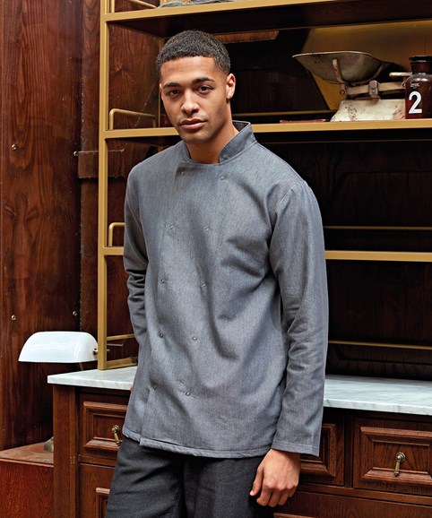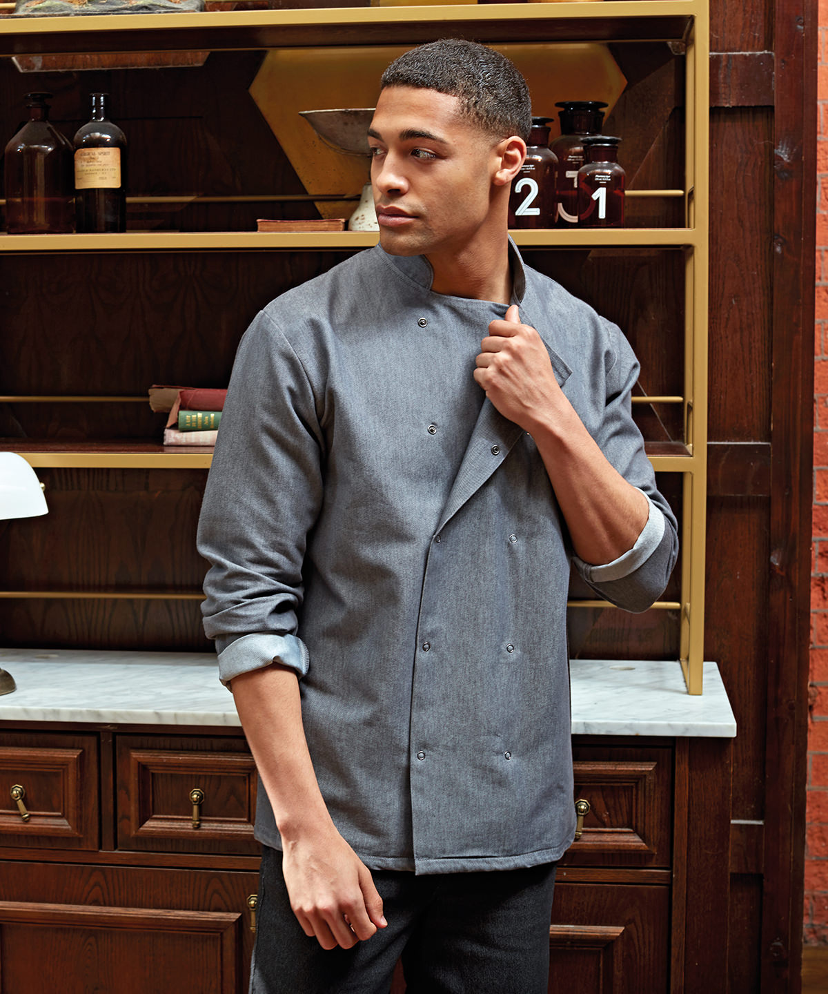 Chefswear-assortiment en geeft de kok een perfect alternatief voor de traditionele witte koksbuis. We hebben deze jas, geïnspireerd door onze populaire PR665-jas met drukknopen, een modieuze twist gegeven door deze in twee populaire denimkleuren te introduceren, gemaakt van 100% ringgesponnen katoen als een zachte en ademende werkkledingoplossing.