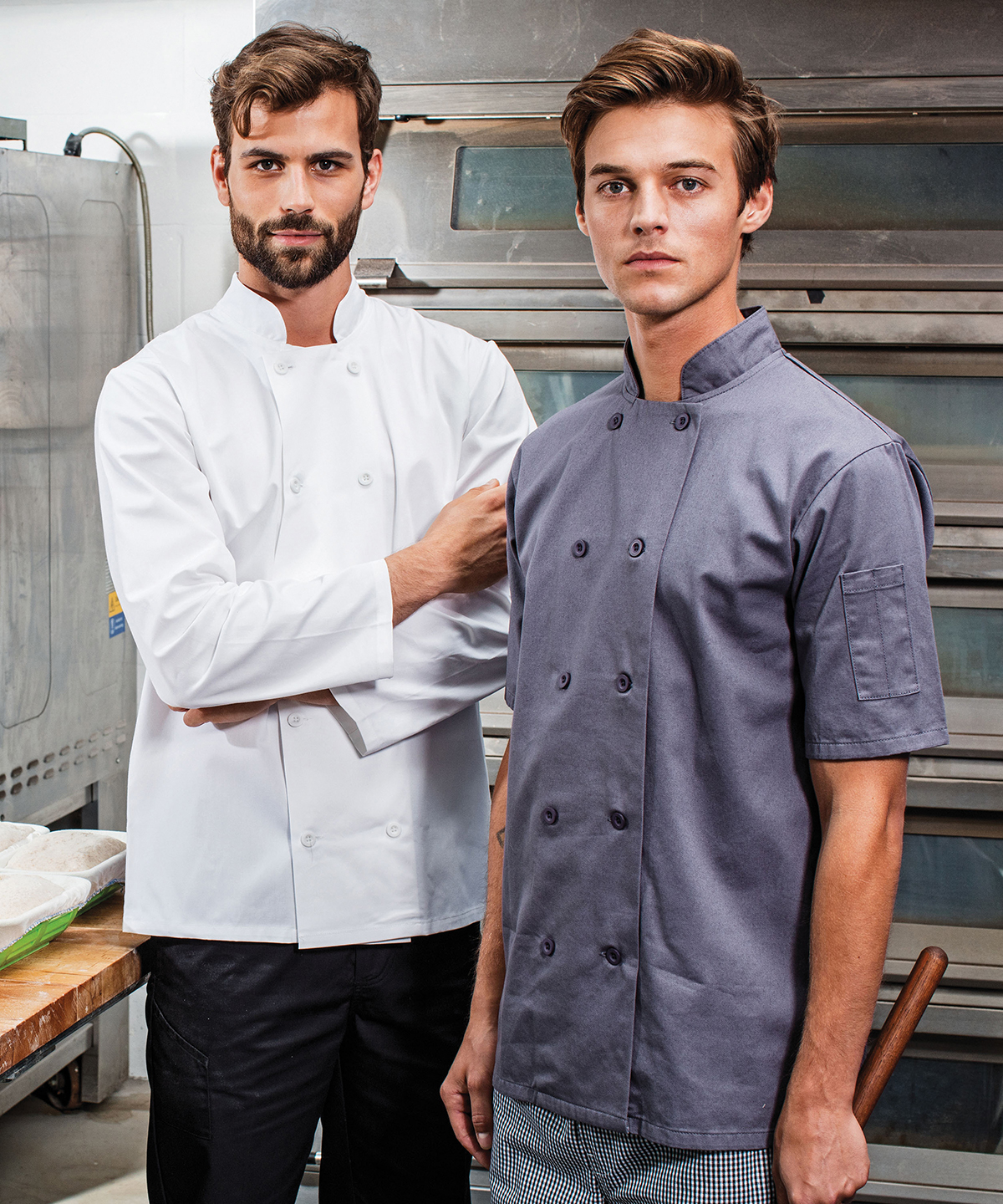 met lange mouwen en een wikkelsluiting met tien knopen. Om aan herhaald wassen te weerstaan, werden duurzame harsknopen gebruikt. Een zeer slimme jas voor een chef-kok met een mandarijnkraag voor een gestroomlijnde look. De linkermouw heeft een handig balpenzakje. Verkrijgbaar in zwart en wit en een breed scala aan maten.