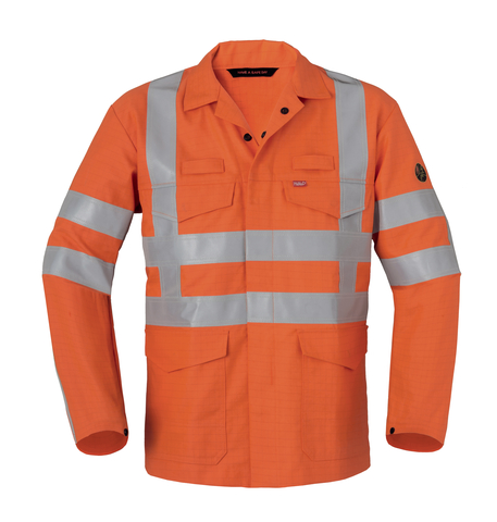 Verdekte drukknoopsluiting, 2 voorzakken met klep, 2 ingezette borstzakken met klep, loshangende binnenzak, 2 vluchtmaskerlussen, mouwen met steldrukkers, RWS striping, verlengd rugpand