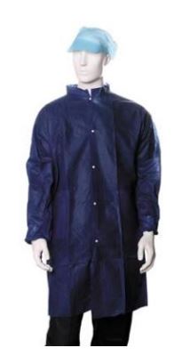 De Polypropyleen laboratoriumjas is voorzien van elastiek in de mouwen, twee zijzakken en 5-knoopsdruksluiting. De marineblauwe laboratoriumjas is een eenvoudig 3/4 model met openstaande kraag.