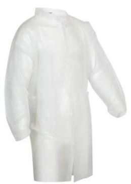Kwaliteit: non-woven polypropyleen (ca 40 grams). 5-knoops druksluiting. Twee zijzakken. Opstaande kraag. Elastiek in de mouwen. Product voor éénmalig gebruik. Kleur: marineblauw.
