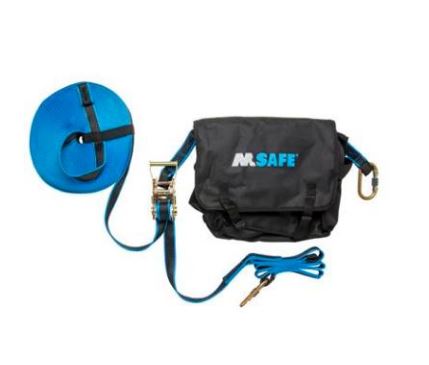 M-Safe 4182 mobiele leeflijn wordt geleverd met twee stalen karabijnhaken en is permanent voorzien van tas voor het opslaan van overtollig band. De leeflijn is geschikt voor twee gebruikers tegelijk en heeft een maximale weerstand van > 25kN.