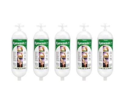 Vijf x 1 liter vervangingsflessen met oogwater voor oogspoelstation 124. Vervangingspakket met vijf flessen oogwater van 1.000 ml en stofkappen. Afmeting: 340 mm (H) x 500 mm (B) x 100 mm (D).