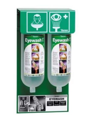Twee x 1 liter oogwater in muurstandaard. Geschikt bij beperkte ruimte en/of wanneer oogwater op een aantal plaatsen in dezelfde ruimte nodig is. Muurstandaard gemaakt van aluminium. Achterzijde gemaakt van polypropyleen. Geleverd met twee flessen oogwater van 1.000 ml, installatie-instructies, muurschroeven en stofkappen. Afmeting: 340 mm (H) x 200 mm (B) x 100 mm (D).