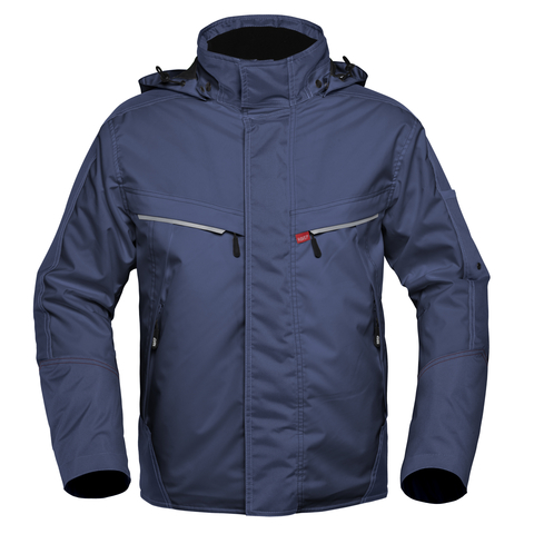 verdekte ritssluiting met verdekte drukknopen, napoleonzak met rits, 2 ingezette zijzakken met rits, binnenzak met rits, 2 ingezette borstzakken met rits waarvan rechter borstzak voorzien is van D-ring voor badgehouder, pennenzakje met nestelring, ademend, wind- en waterdicht met getapete naden, windvangers, verlengd rugpand, reflecterende piping, verstelbare afneembare capuchon met drukknopen, fleece aan binnenzijde kraag, kinbeschermer