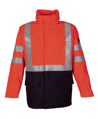 Product details Hoogste bescherming in multi-risk situaties De parka beschermt volgens EN 343 ook tegen regen en slecht weer Parka kan gecomplementeerd worden met fleecevest 40012 of 40003 Ademend, winddicht en waterafstotend Kwaliteit 54%/45%/1% modacryl/katoen/carbon, 2/1 keperbinding + DWR, 320 gr/m2; kleur fluo oranje 50%/27%/22%/1% polyester/modacryl/katoen/carbon + DWR, 355 gr/m2 Beschrijving verdekte ritssluiting met drukknopen en klittenband, napoleonzak, 2 voorzakken met klep, 2 ingezette borstzakken met klep, verstelbare taille, 2 vluchtmaskerlussen, verdekte capuchon in kraag, reflectieband