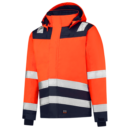 door de printerrits. De rug wordt bij het bukken tijdens de werkzaamheden bedekt door het verlengde achterpand, welke tevens inklapbaar is. De tricot manchet met duimgaten biedt extra bescherming en warmte voor de handen. De onderkant van de jas is middels een koord aan de binnenzijde naar wens te verstellen. Deze parka heeft een gewatteerde voering en heeft een kort model tot op de heupen. De Midi Parka High Vis Bicolor is verkrijgbaar in drie verschillende bicolor kleurcombinaties, waaronder ook onze nieuwe kleurcombinatie fluor-red ink. High Visibility, Waterdicht, Ademend, Winddicht, Reflectiestriping, 20/20 Vision, 2020 Vision, Capuchon, Oxford, Polyester, Bi-color, Jassen, EN 343:2003 Klasse 3:1, EN ISO 20471:2013 Klasse 2, 40 °C, Afritsbare capuchon, Getapete naden, Manchet met klittenband, Printerrits aan de binnenkant, Stormflap over rits, Tricot manchet met duimgaten, Verdekte zakken met rits op voorpand, Verlengd achterpand (inklapbaar), Verstelbare onderkant door koord aan binnenzijde, Wind- en waterdicht, Zak naast ritssluiting.