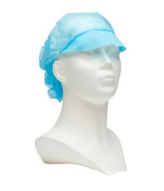 De Polypropyleen pet is voorzien van latexvrij elastiek en is inclusief haarnet. De blauwe pet met klep is non-woven en wordt verpakt per 100 stuks.