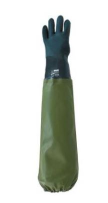 Linker handschoen. Handschoen met waterdichte kappen. Elastiek in de mouwen. Goede pasvorm. Olie en vet bestendig. Met jersey voering. Lengte: 700 cm (totaal). Kleur: groen.