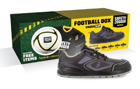 Promobox met 1 paar veiligheidsschoenen Cador, een Safety Jogger voetbal, een voetbal shirt en 1 paar kousen. Bestel nu vooraf, levering vanaf midden april.