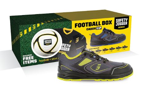 Promobox met 1 paar veiligheidsschoenen Cador, een Safety Jogger voetbal, een voetbal shirt en 1 paar kousen. Bestel nu vooraf, levering vanaf midden april.