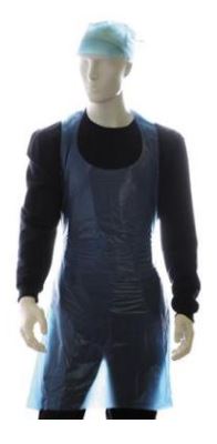 Kwaliteit: polyethyleen. De schorten zitten op een blok en zijn daardoor makkelijk af te scheuren. Vast te maken door twee stroken aan achterzijde aan elkaar te knopen. Afmeting: 107x78 cm. Dikte: 22 mu. Verpakt per 100 stuks. Doosverpakking: 10x100 stuks. Kleur: blauw