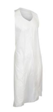 Kwaliteit: non-woven polyethyleen. Vast te maken door twee stroken aan achterzijde aan elkaar te knopen. Afmeting: 125x80 cm. Dikte: 25 mu. Verpakt per 100 stuks. Dit schort is voor éénmalig gebruik. Kleur: wit.