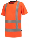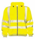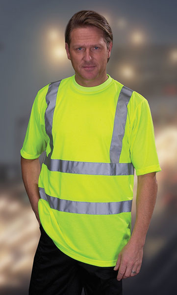vertikale en horizontale reflecterende strepen aan voor- en achterkant, ribgebreide halsboord, nekband, ribgebreide mouweinden, dubbeldraads gestikt aan onderboord, Hi-Vis Yellow = EN 471 klasse 2.