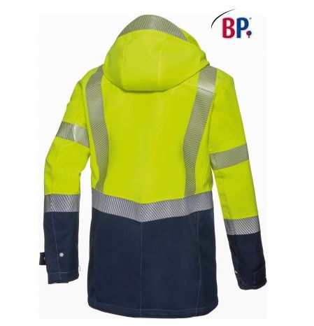 Opstaande kraag, afknoopbare capuchon in hoogte en breedte verstelbaar, waterdichte ritssluiting aan de voorkant met dubbele drukknopenlijst, gelaste naden, 2 zijzakken met drukknoopsluiting, 1 Napoleonzak met ritssluiting, ergonomisch gevormde mouwen, verstelbare manchetten, 1 binnenzak met ritssluiting, grote rits in voering om reparaties te vergemakkelijken, 2 reflecterende strepen op de mouw, 1 doorlopende reflecterende streep boven de zoom, 2 doorlopende verticale reflecterende strepen op voor- en rugpand, combineerbaar met warm BP® fleecejack 2424-860-0014.
