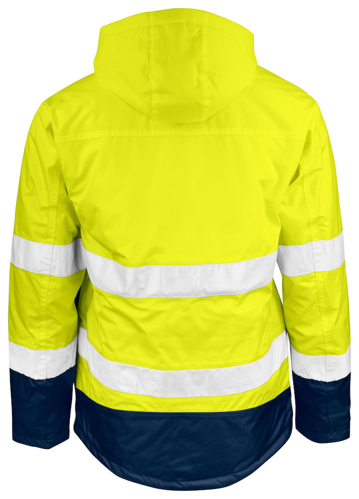 Praktische Hi-Vis wind- en waterbestendige jas met getapete naden en capuchon. De jas is voorzien van diverse zakken waaronder borstzakken met klep en klittenband sluiting en waterdicht ritsen, steekzakken met klep en rits en drie binnenzakken voor het veilig opbergen van waardevolle spullen. De capuchon is gemakkelijk te verstellen middels een trekkoord en afneembaar met drukknopen. Waterkolom: 23000mm, ademend vermogen: 3300 g/m². Klasse 3 gecertificeerd volgens EN ISO 20471. Gecertificeerd volgens EN 343, de normering voor regenkleding.